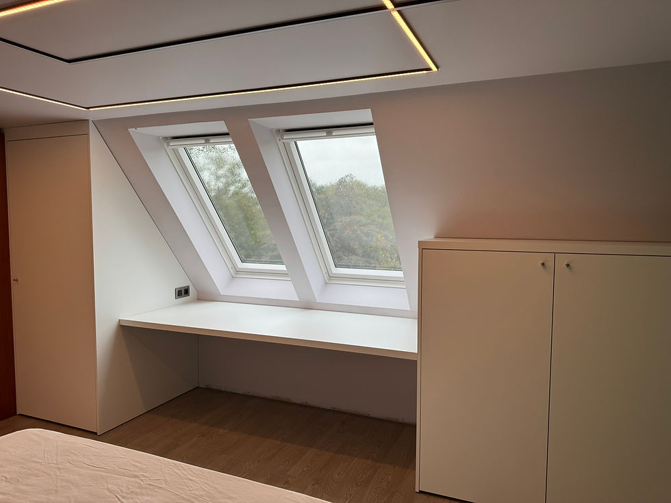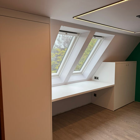 Transformeer je slaapkamer met een meubel dat een geïntegreerd bureau biedt. Dit praktische ontwerp combineert functionaliteit met een strakke uitstraling. Perfect voor kleinere ruimtes met een schuin dak.