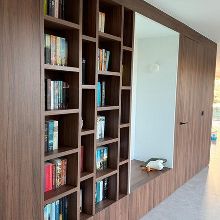 Een prachtig op maat gemaakt meubel in je leefruimte dat functionaliteit en stijl perfect combineert. Dit unieke meubel fungeert als een stijlvolle basis voor je tv, terwijl het ook een geïntegreerde boekenkast heeft. Met nissen voor je favoriete boeken en decoraties wordt het een sfeervolle plek om je persoonlijke collectie te tonen.